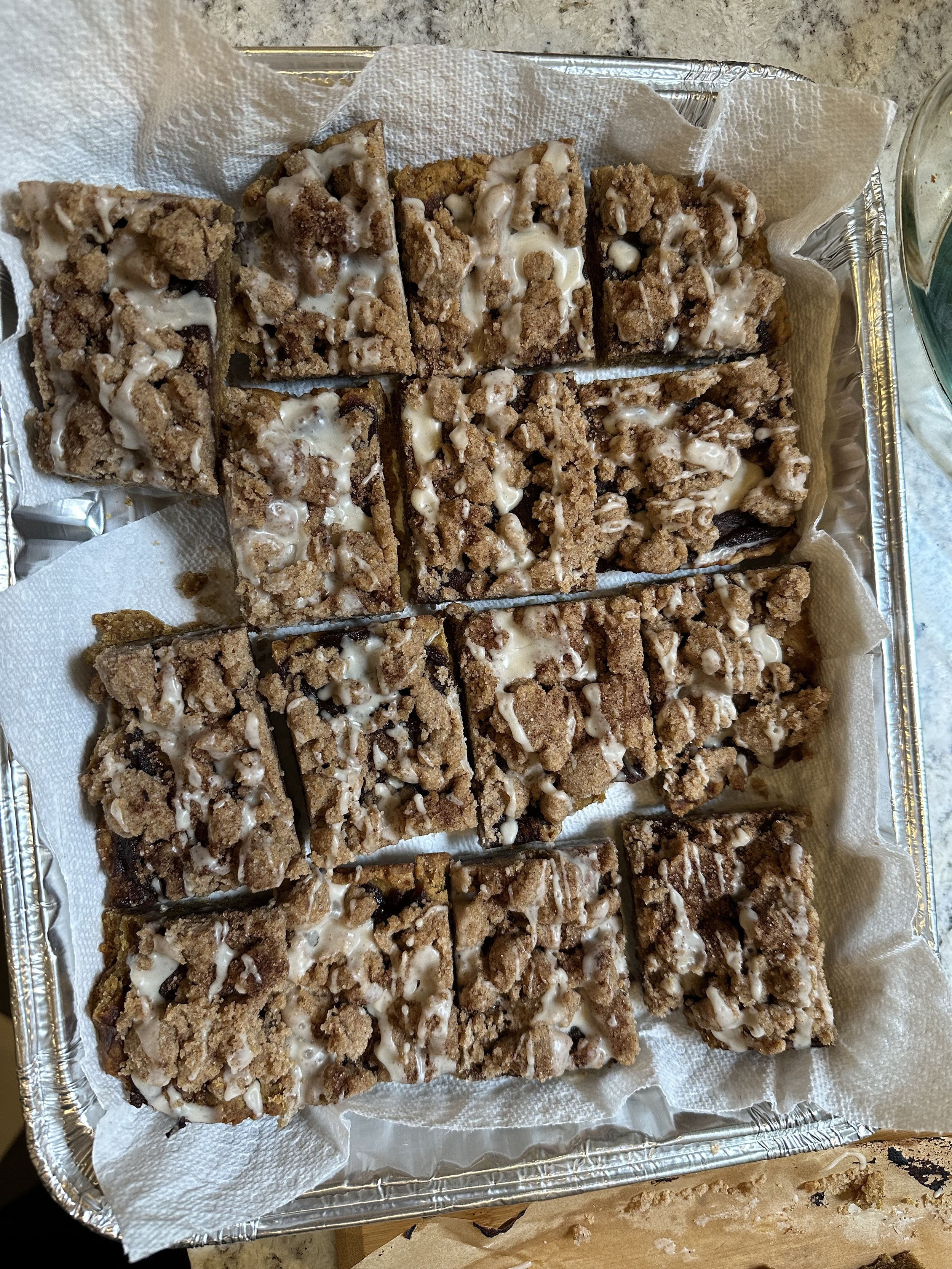 Bake for 15 minutes at 325°F. While it’s baking prepare the cinnamon streusel.